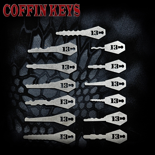 The Sparrows Coffin Keys set consists of 13 rocker picks of various sizes. Coffin keys work in a wide variety of wafer and pin tumbler locks. The picking action is simply insert the pick into the keyway while rocking the key up and down at times apply torque to the key by turning it gently. Slide the key in and out while also trying a different size and patterned Keys. Coffin keys are a mix between picking and using a skeleton key.